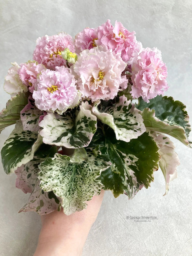 С красивейшей расписной розеткой с крупными махровыми бело-розовыми цветами с желтой пропиткой в центре цветка: