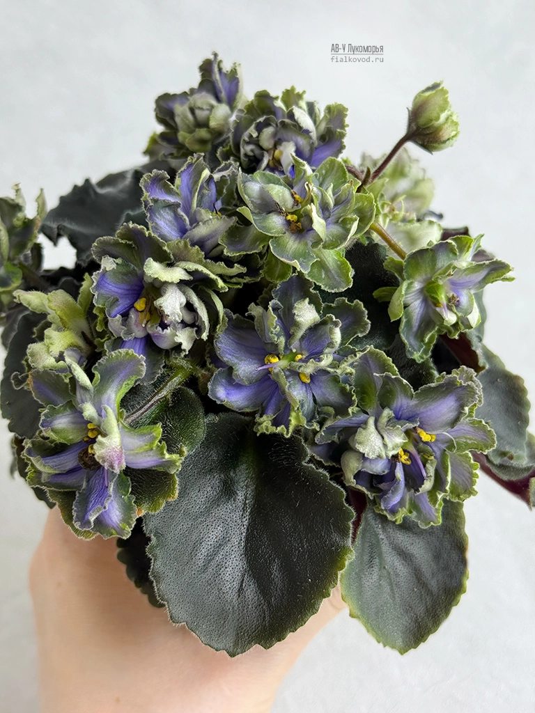 Сине-зеленые с редким светлым фэнтези крупные полумахровые и махровые цветы-кувшинки на темно-зеленой некрупной розетке. Цветы держатся очень долго!