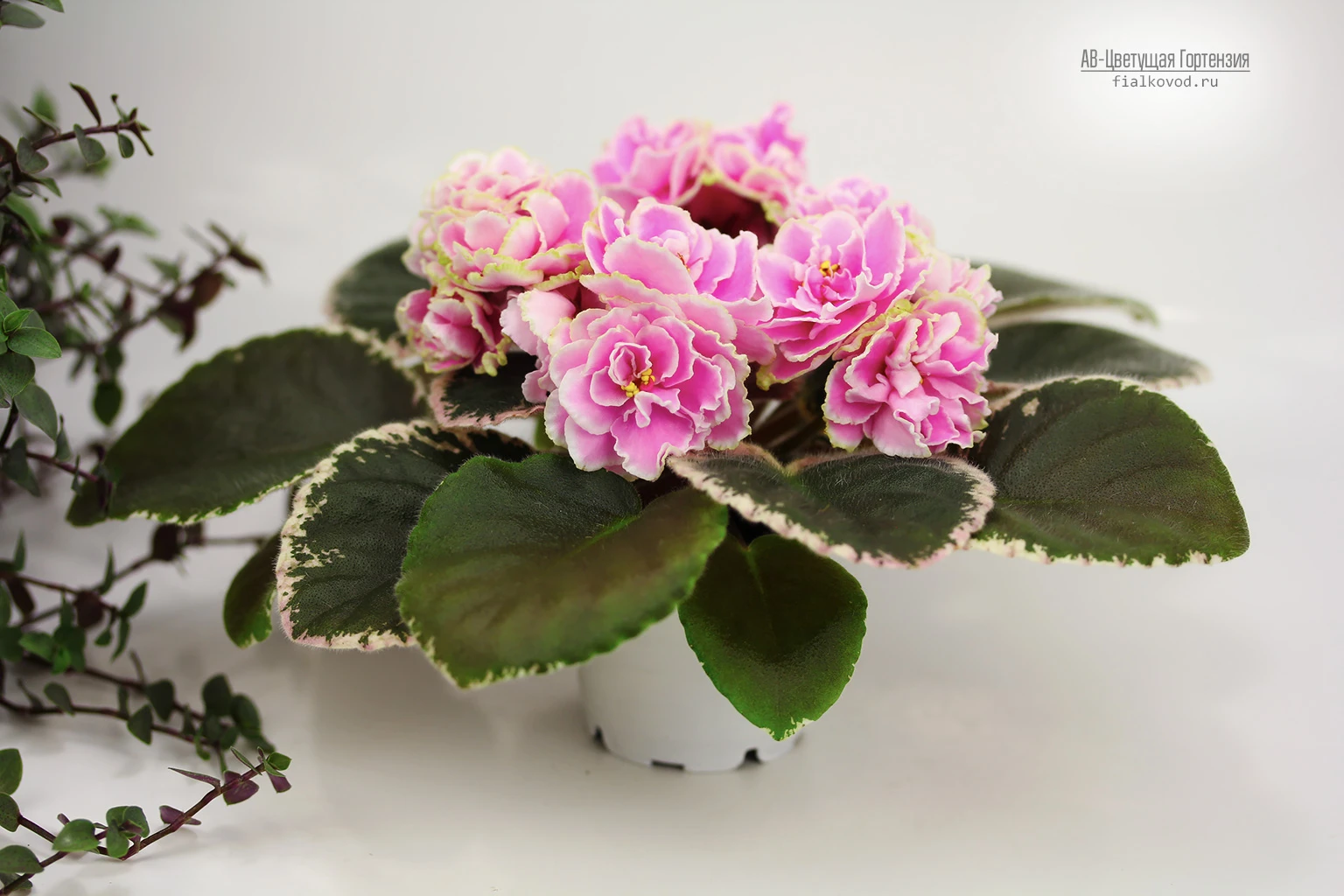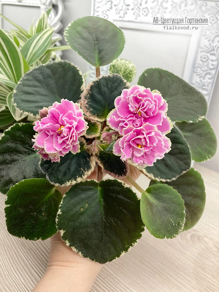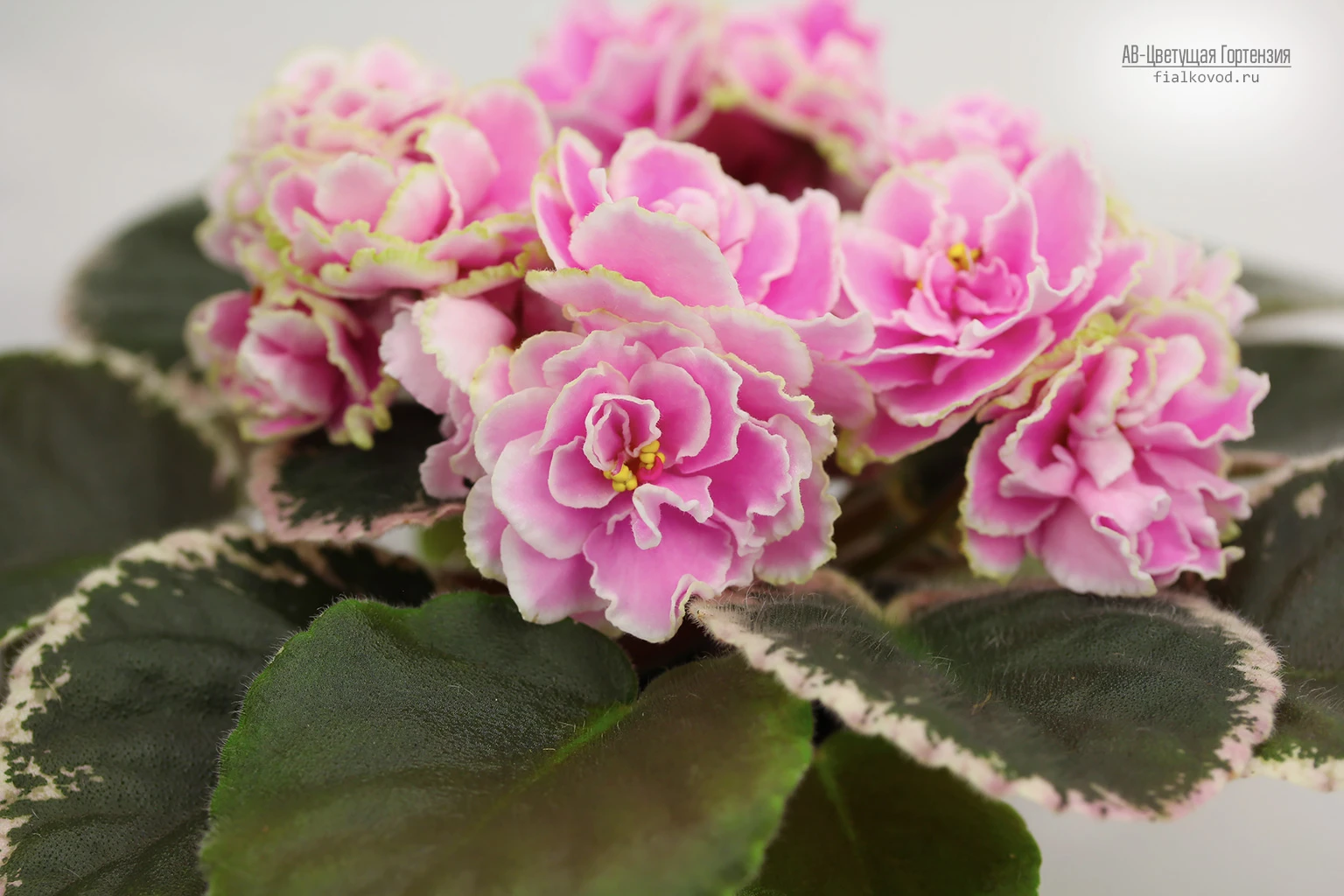 Розовые цветы-розочки с бело-салатовой каймой на пестрой аккуратной розетке: