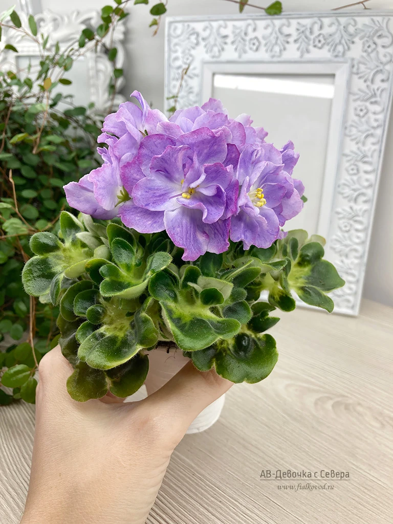 Полуминиатюра АВ-Белая Сирень с шапкой махровых цветов-кувшинок на пестрой слегка удлиненной розетке. Отлично держит цветы, цветы плотные, "восковые":