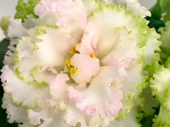 Селекционер: Бердникова Н. Цветок: Махровые, белые с розовинкой или нежно-розовые цветы. Обильное цветение. Розетка: Аккуратная розетка из светлой листвы с кроновой пестролистностью. | Лист, 120 руб. |