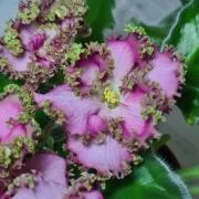 Селекционер: J. Stromborg Цветок: Простой-полумахровый, сильно оборчатый светло-розовый цветок с темно-розовыми «перьями» и зеленой каймой на верхних лепестках. Розетка: Темно-зеленая сердцевидная, зубчатая листва. | Лист, 200 руб. |