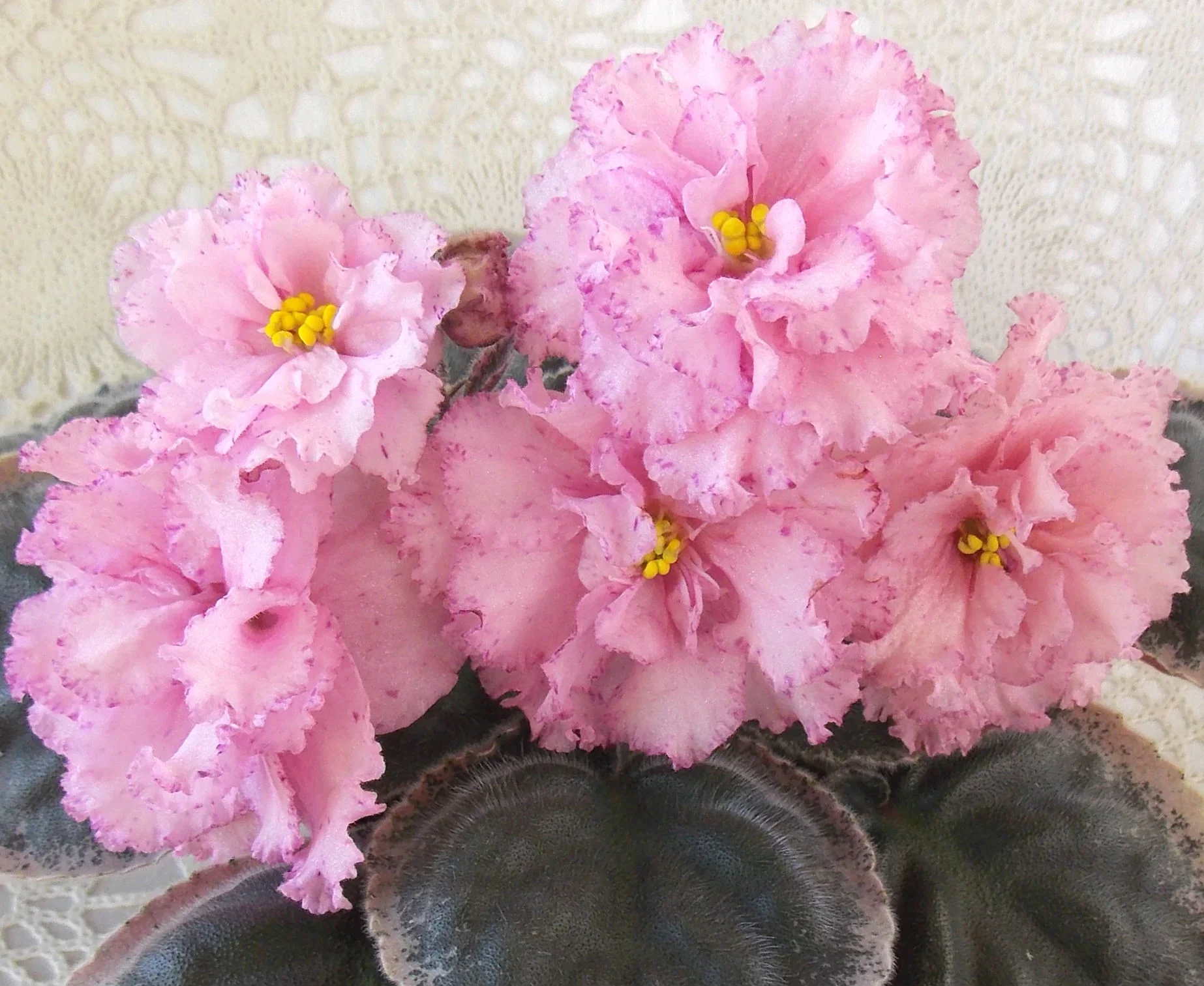 Цветок: Розовые полумахровые и махровые звезды с гофрированной фуксиево-бордовой каймой забрызганы такого же цвета конопушками.