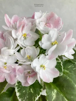 Цветок: Полумахровые белые анютки с подвернутыми внутрь лепестками с вариабельными розовыми тенями и сиренево-розовым фэнтези на них. Обильное цветение.