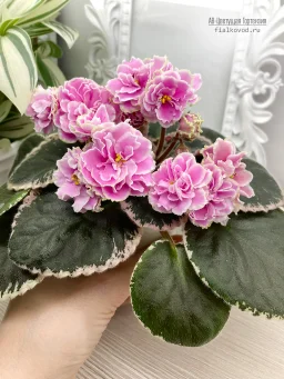 Розетка: Темно-зеленые стеганные зубчатые листья с бело-розовой окаймляющей пестролистностью.
