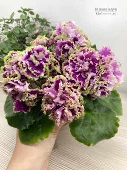 Цветок: Крупные густо-махровые гофрированные белые звезды с малинвовыми напечатками и зеленым рюшем.