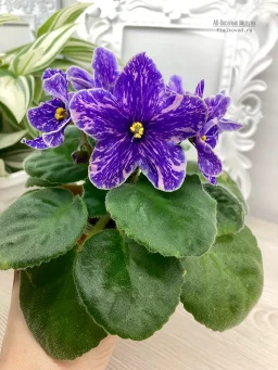 Цветок: Очень крупные простые неопадающие синие звезды с округлыми лепестками с розовым фэнтези и белой каймой.