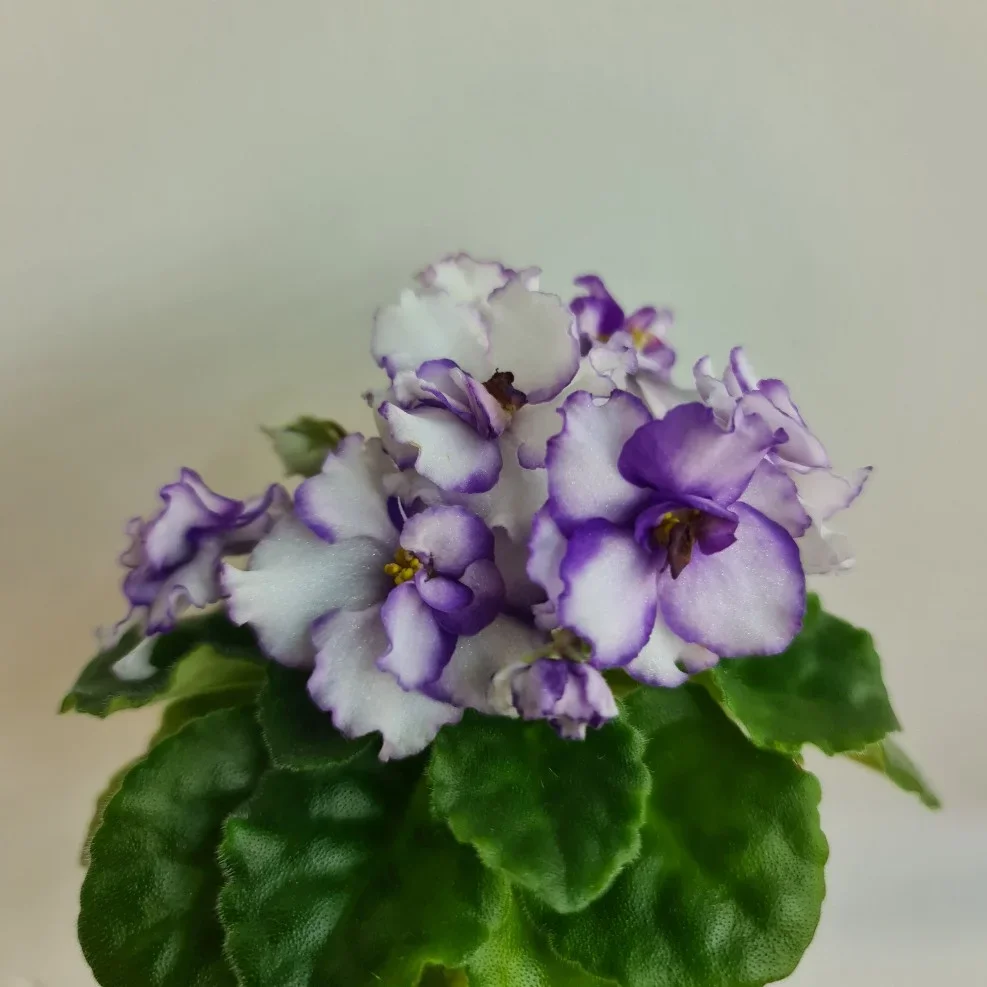 Цветок: Крупные белые полумахровые цветы с голубой каймой.