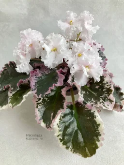 Розетка: Красивые заостренные средне-зеленые листья с бело-салатовой окаймляющей пестролистностью. Иногда получаются розетки с темными листьями с розовой пестролистностью, но цветок все равно остается светлым. Компактная розетка. Сорт не нуждается в ярком освещении.
