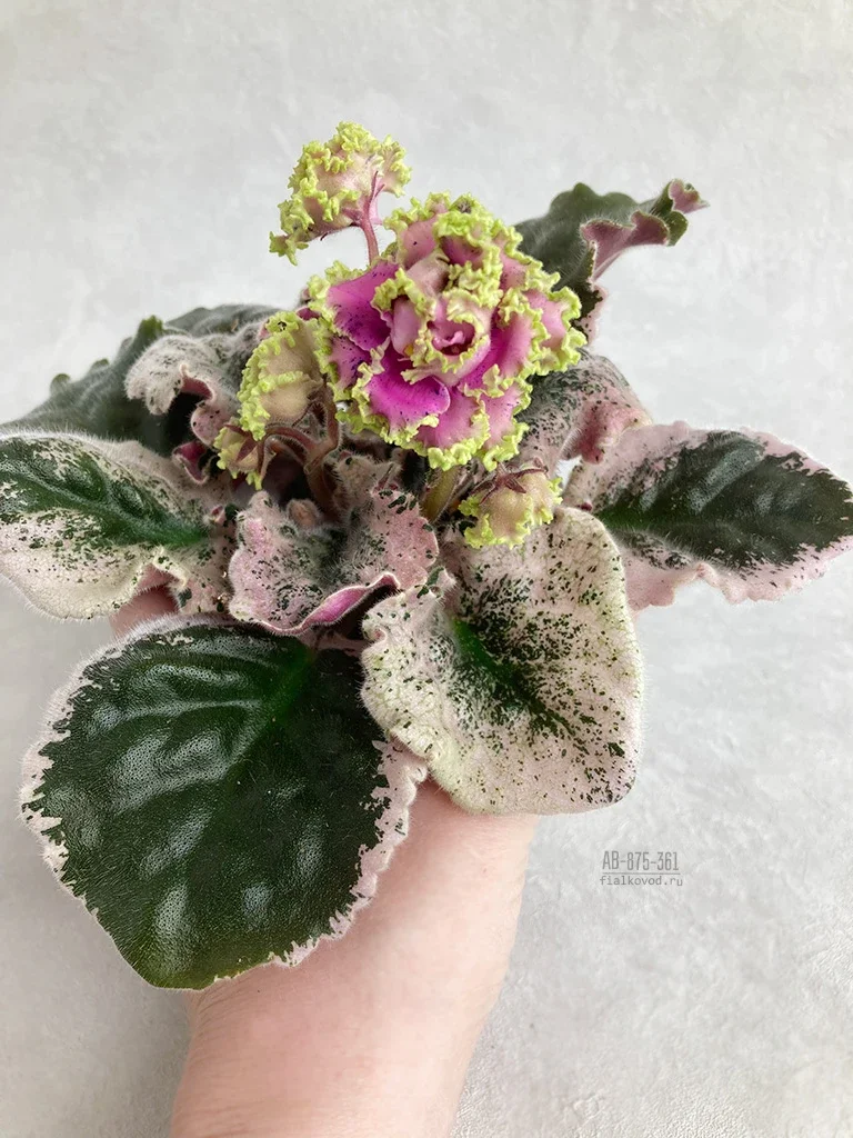 Розетка: Темно-зеленые, стеганные, зубчатые, слегка волнистые листья с красивой розово-салатовой пестролистностью.