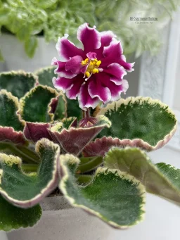 Розетка: Насыщенно-зелёные листья с мелкими зубчиками с кремовой окаймляющей пестролистностью.